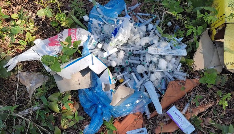 El fin de semana nuevamente se encontró una importante cantidad de residuos, en el camino que conduce al vertedero municipal, consistentes en jeringas, agujas, ampollas, algodones y algunos fármacos.