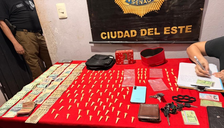 Del lugar se procedió a la incautación de 102,65 gramos de cocaína distribuidos en 123 dosis, preparadas en pequeños paquetes de plástico tipo “pinos” dosificadores, listos para su comercialización; así como más de 2 millones de guaraníes en efectivo, presumiblemente producto de la venta de drogas