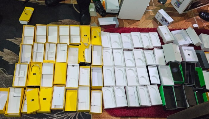 Con la autorización del propietario, la comitiva ingresó al local, donde se hallaron tres mesas de escritorio, dos estantes con cajas de cigarrillos y varias cajas de cartón que contenían empaques vacíos de aparatos celulares de distintas marcas y modelos.